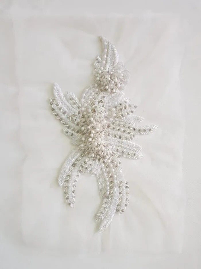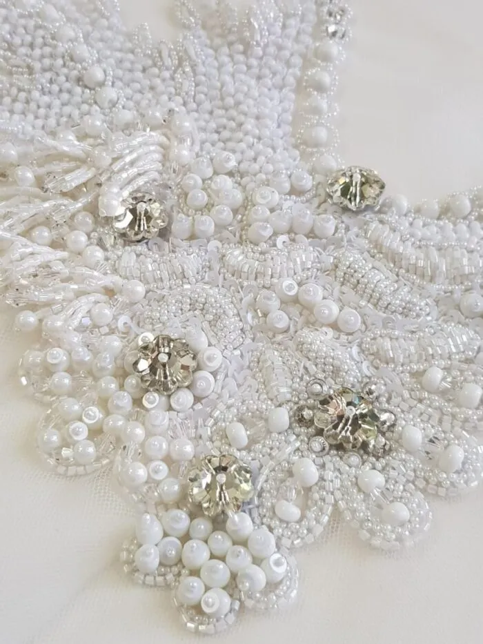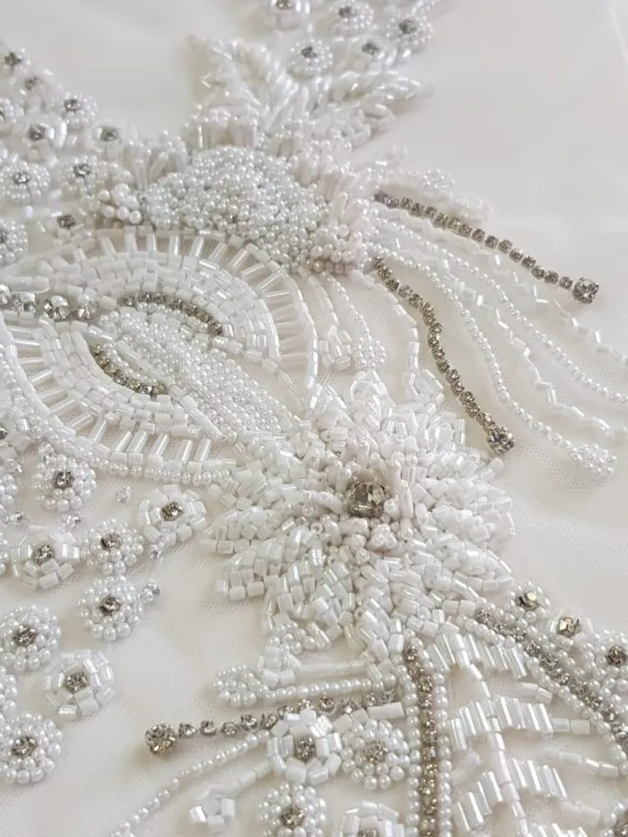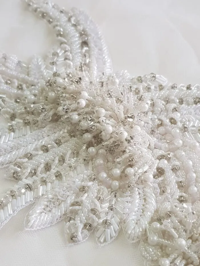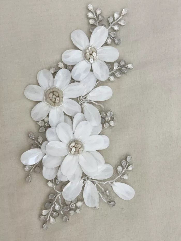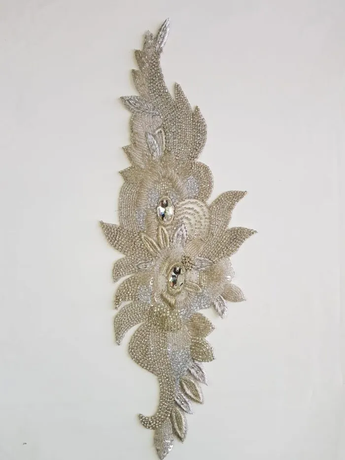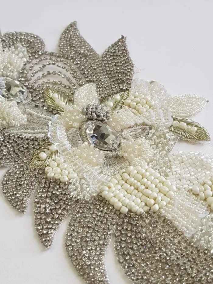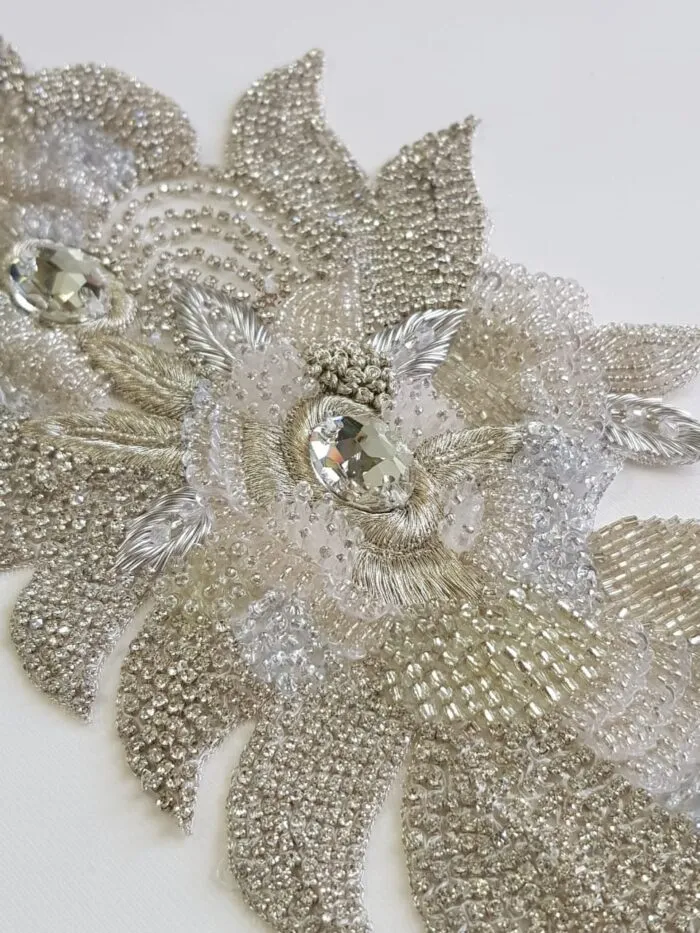 Aplique bordado con cristales en tono plata viejo – 49 cmCinto artesanal bordado con cristales facetados y mostacillas en tono plata viejo, dispuestos en un motivo floral continuo.Las piedras centrales aportan brillo intenso, mientras que el trabajo de microbordado genera textura y relieve.Con una longitud total de 49 cm, es ideal para acentuar la cintura en vestidos de novia o alta costura, aportando un acabado luminoso y sofisticado. Se vende por pieza $ 201,53 por pieza