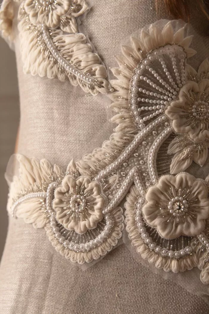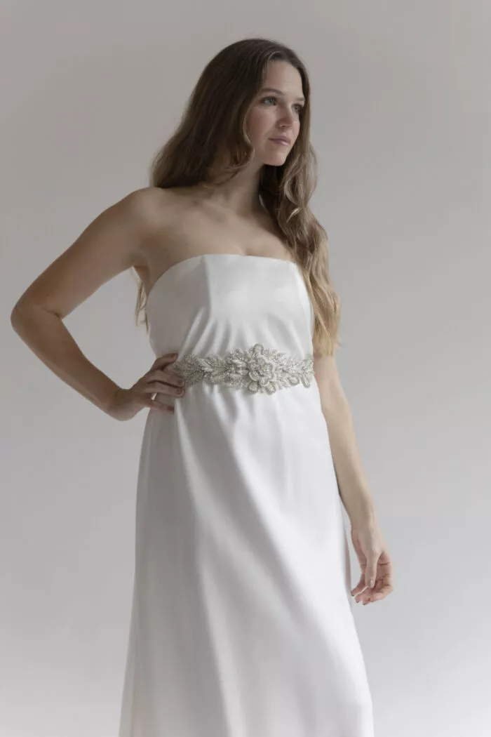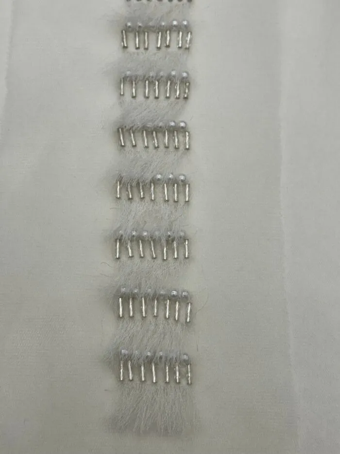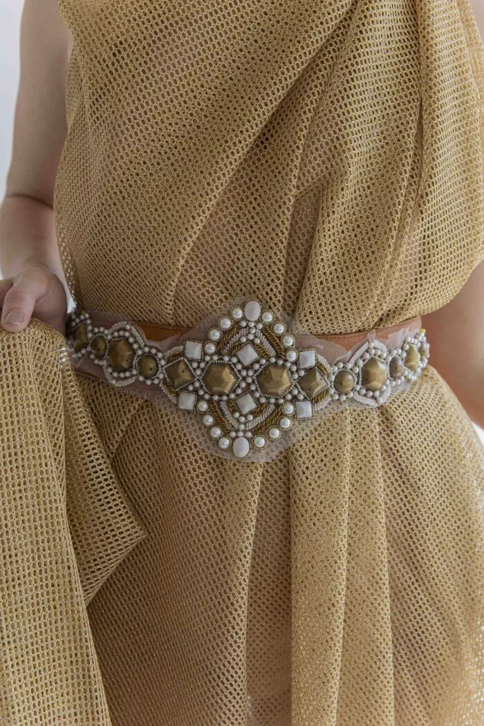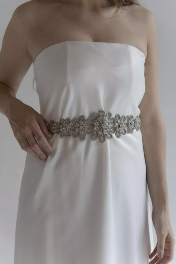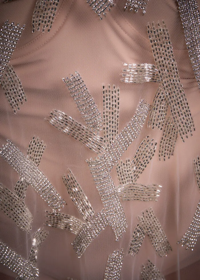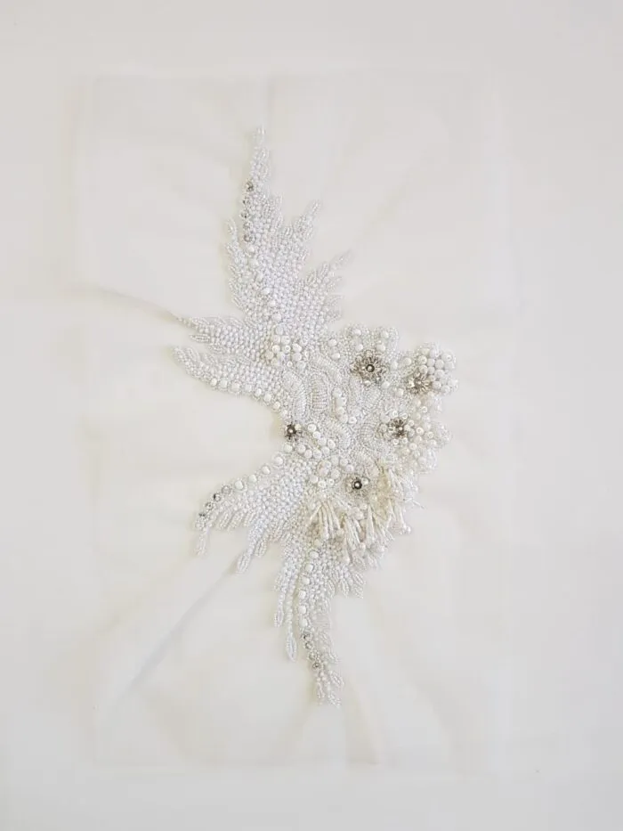 Aplique bordado con cristales en tono plata viejo – 49 cmCinto artesanal bordado con cristales facetados y mostacillas en tono plata viejo, dispuestos en un motivo floral continuo.Las piedras centrales aportan brillo intenso, mientras que el trabajo de microbordado genera textura y relieve.Con una longitud total de 49 cm, es ideal para acentuar la cintura en vestidos de novia o alta costura, aportando un acabado luminoso y sofisticado. Se vende por pieza $ 201,53 por pieza