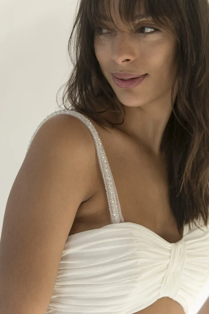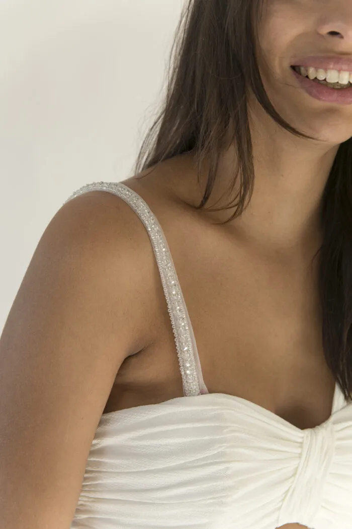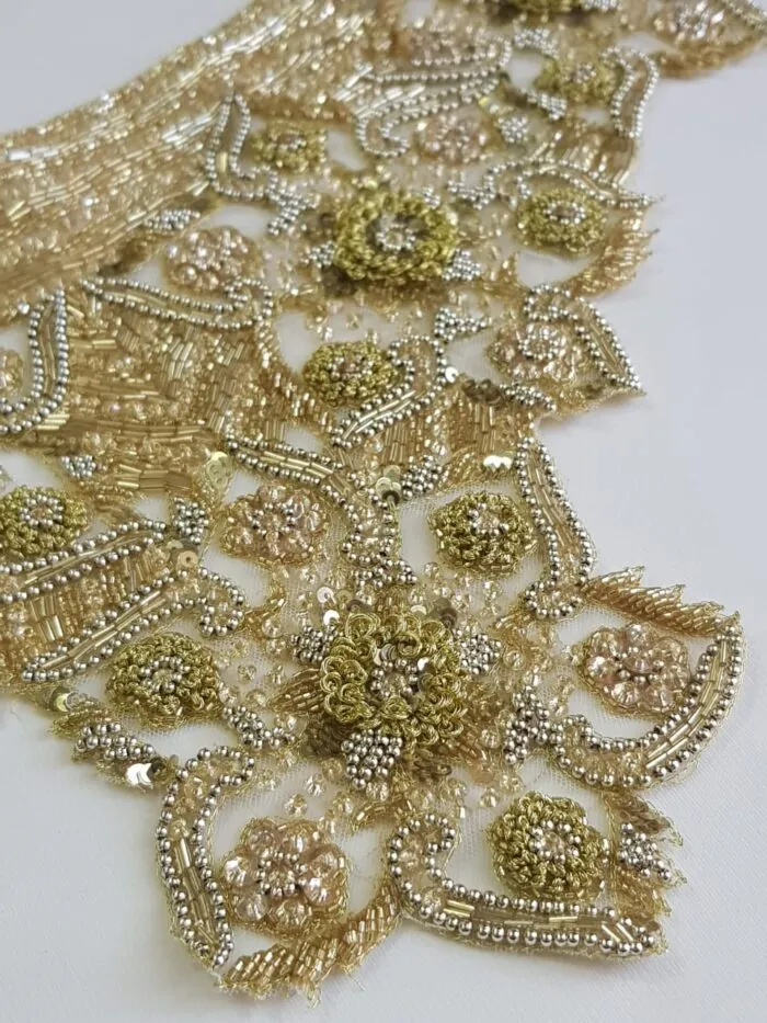 Su composición detallada y su formato alargado lo hacen ideal para realzar hombros, escotes o faldas en vestidos de novia y alta costura. Se vende por pieza.