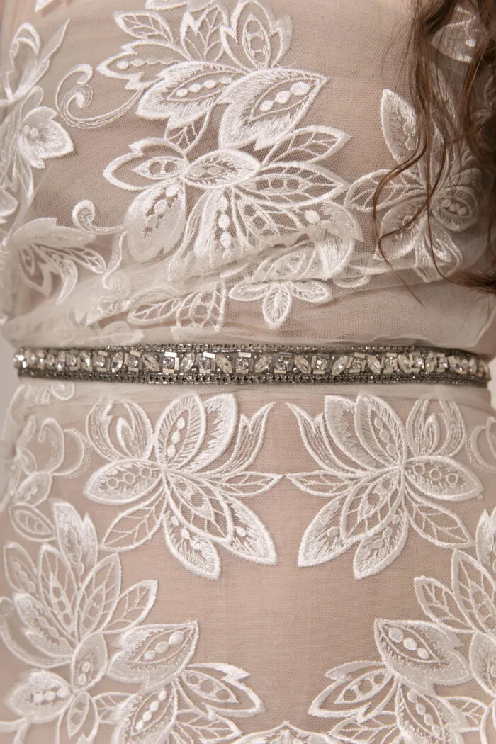Aplique bordado con flores tridimensionales en gasa con base de lentejuela, acompañado por ramas con mostacillas y cristales acrílicos.