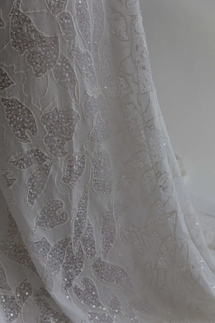 Base de red de algodón romboidal bordada a mano con canutillos y perlas, generando un falso liso de textura artesanal.