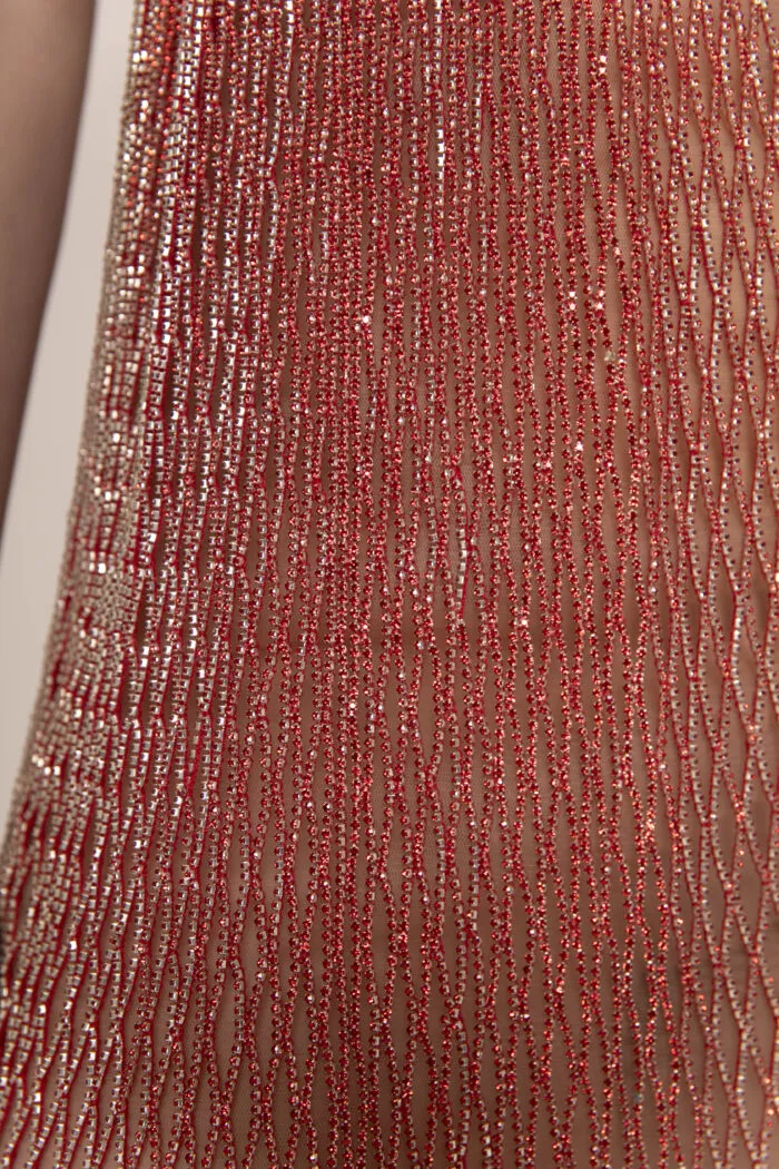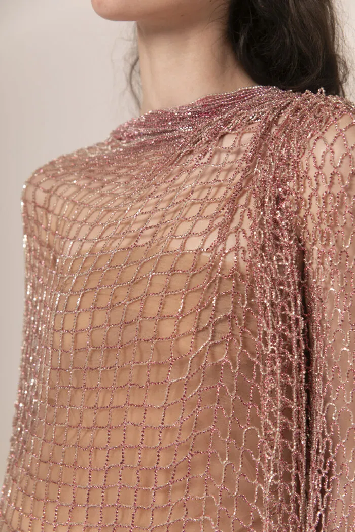 El diseño, de trazos orgánicos y estructura moderna, genera una superficie de brillo controlado y textura escultórica sobre la transparencia del tul.