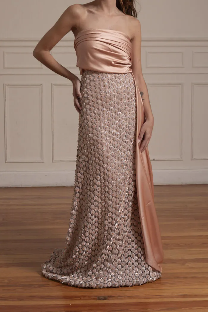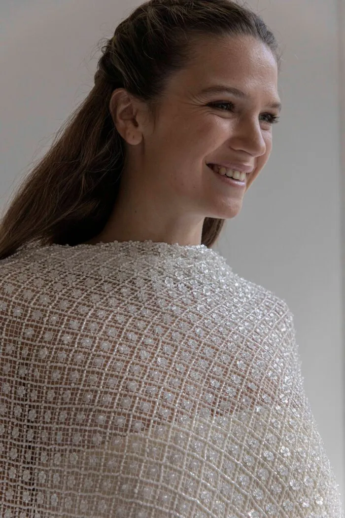 El contraste entre la estructura abierta del tul y la densidad del bordado aporta un equilibrio entre ligereza y presencia.