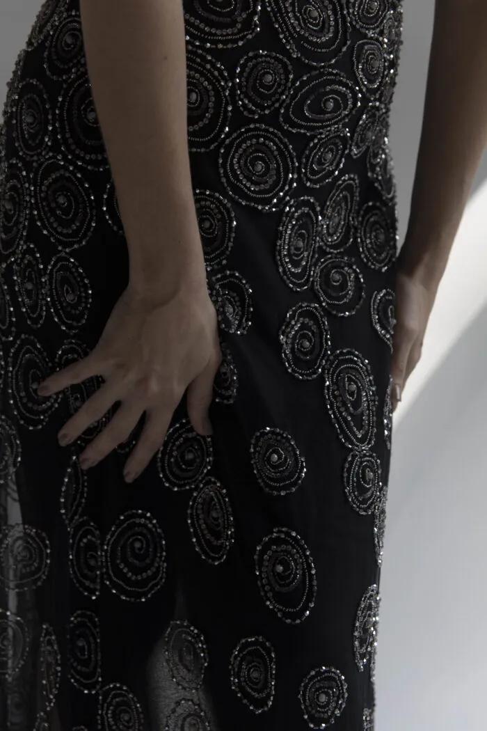 El bordado combina materiales translúcidos y metálicos al tono, generando un efecto lineal de brillo y movimiento.