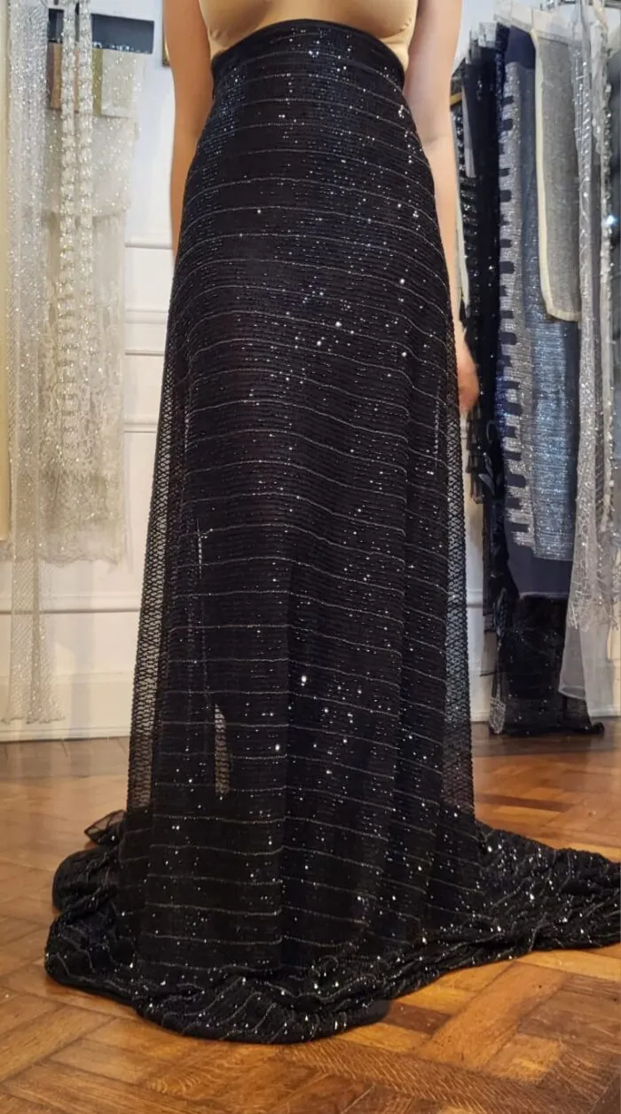 Posee una caída fluida y estructura flexible, ideal para capas, vestidos o sobrefaldas de alta costura que buscan movimiento y textura. Se vende por metro.