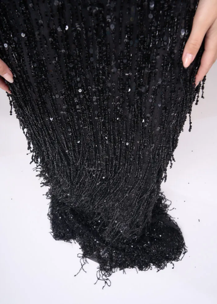 Red bordada con canutillos y perlas al tono, aplicados manualmente sobre una base de tul fino.