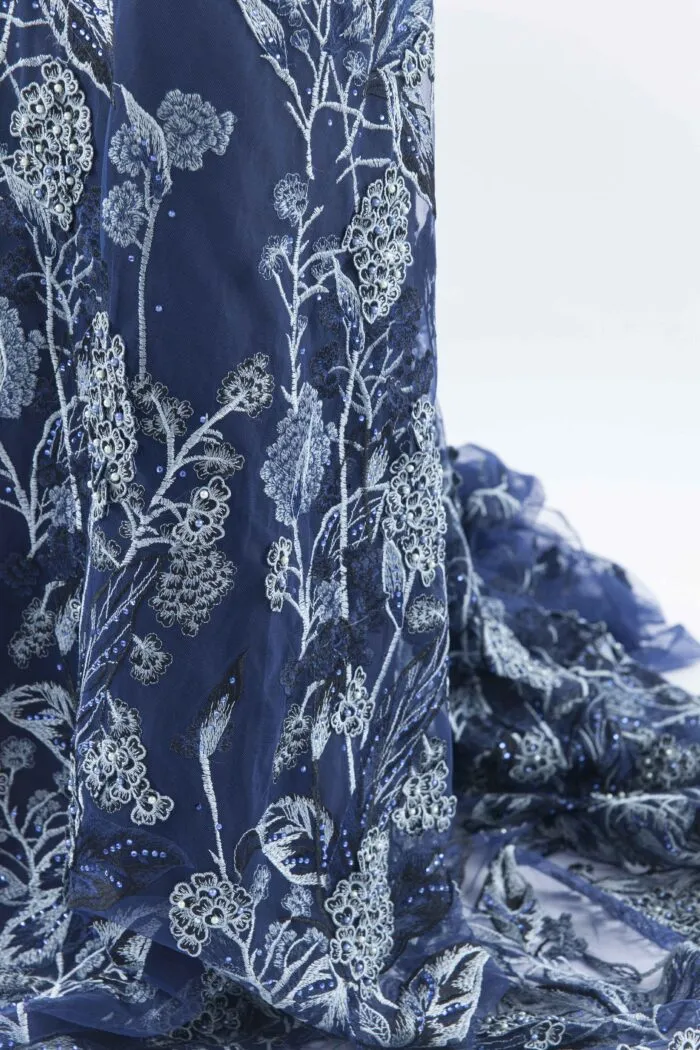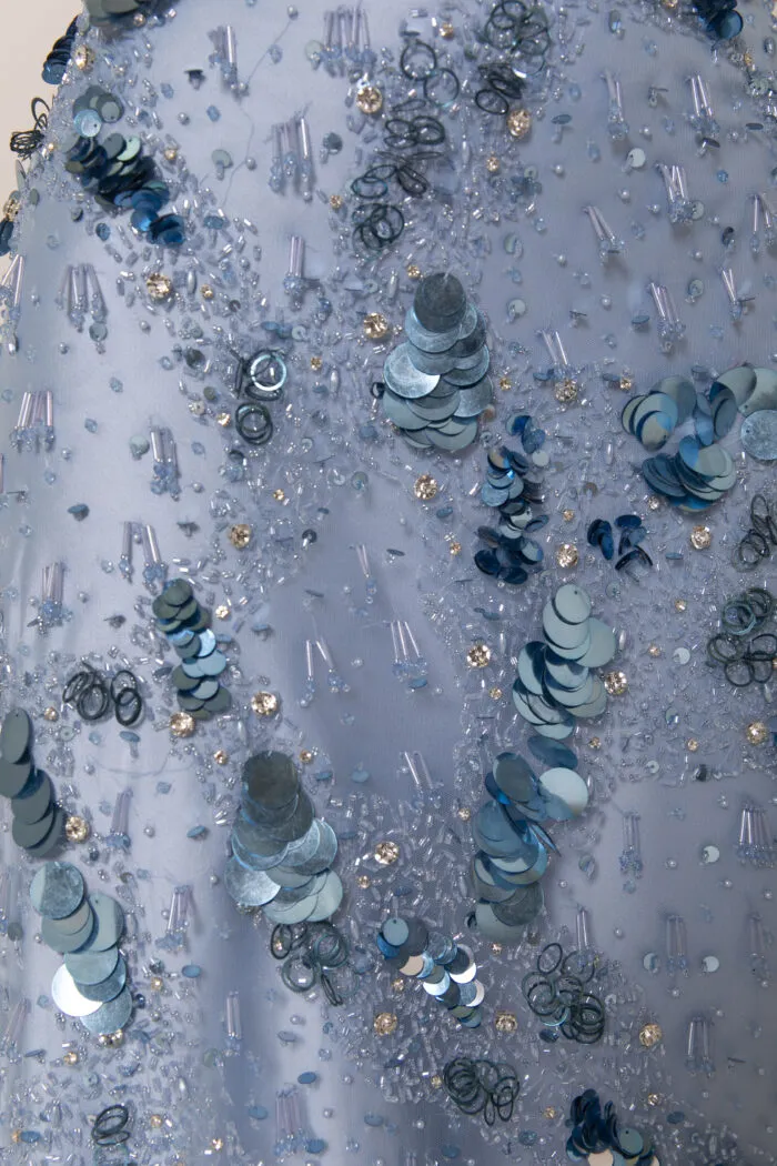 El diseño orgánico de líneas ascendentes combina bordado plano y en relieve, generando una textura tridimensional con movimiento y profundidad.