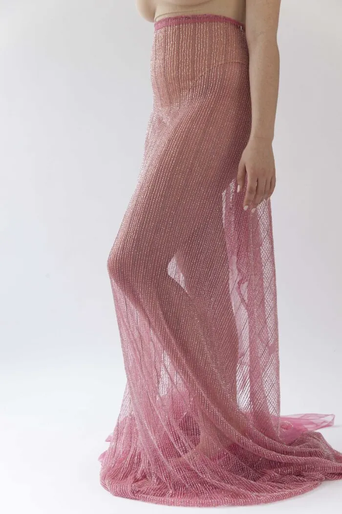 Red bordada en tono rosa empolvado, trabajada artesanalmente con hilo, perlas, canutillos y lentejuelas transparentes.
