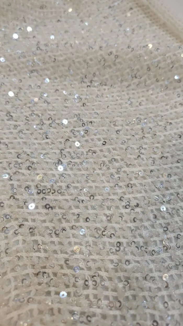Integramente bordada a mano con acrílicos facetados en diseño floral y strass en el centro de cada motivo.