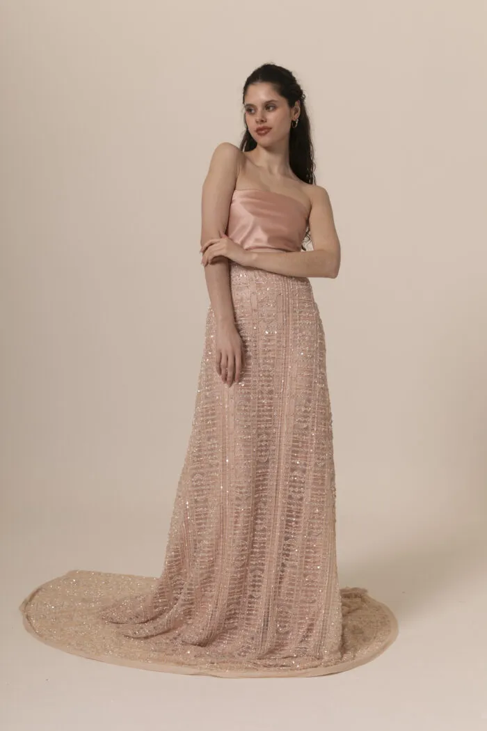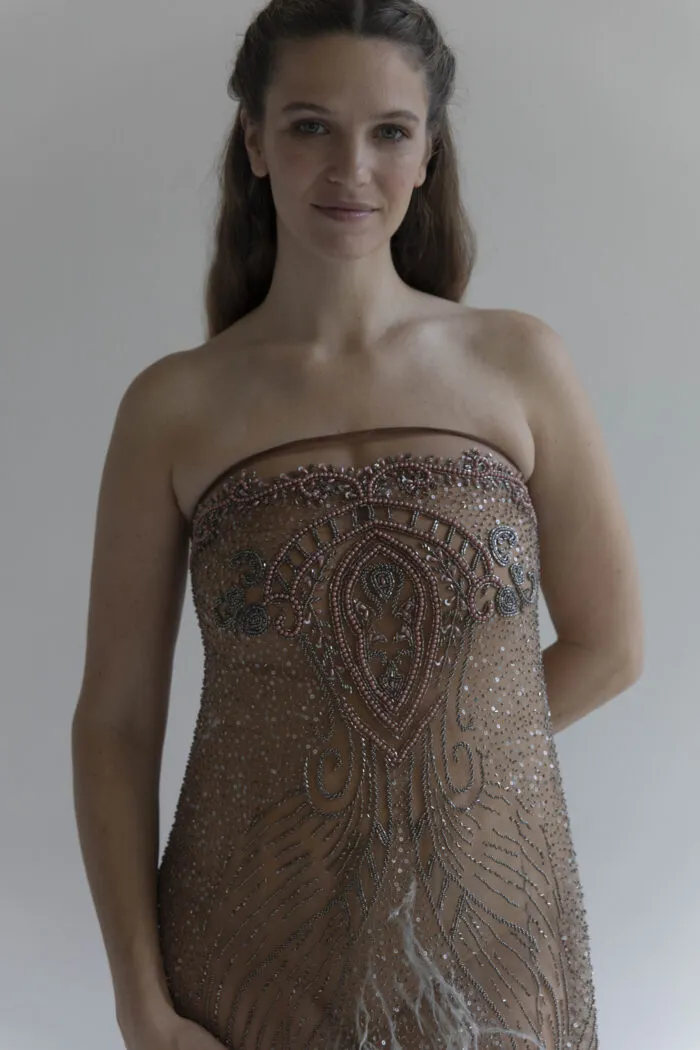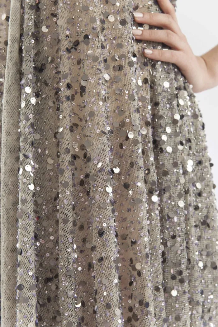 Cada pieza es el resultado de un trabajo artesanal minucioso, donde los cristales facetados se aplican uno a uno sobre la red, generando una superficie luminosa, flexible y de caída fluida.