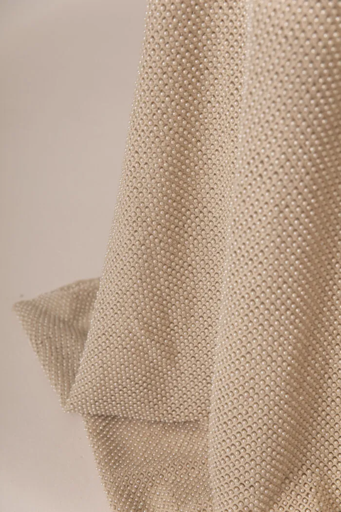 Textil compuesto por puntillas unidas mediante un bordado de canutillos transparentes que crean una textura lineal única.